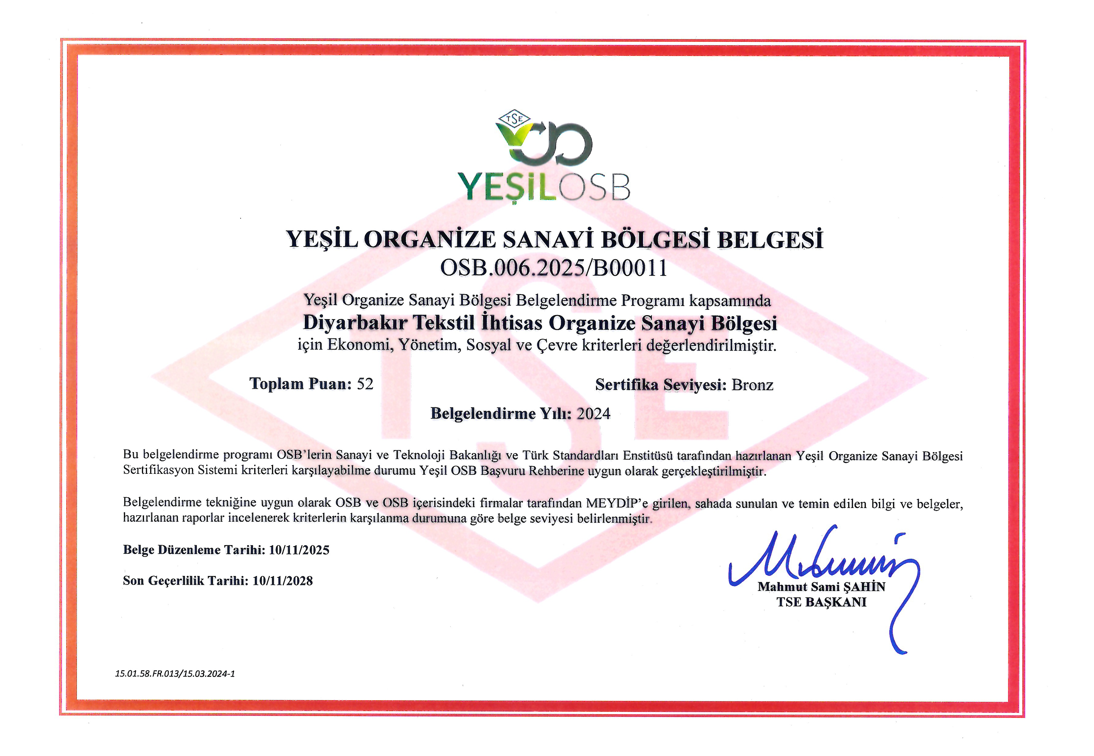Sanayi ve Teknoloji Bakanlığı tarafından yürütülen Yeşil OSB Sertifikasyon süreci kapsamında yapılan değerlendirmelerde; enerji verimliliği, su kaynaklarının etkin yönetimi, atık yönetimi, çevre dostu altyapı uygulamaları, yenilenebilir enerji kullanımı ve sürdürülebilir üretim politikaları gibi birçok kriter titizlikle incelenmiştir. Bu kapsamlı süreç sonunda Diyarbakır Tekstil İhtisas OSB, çevreye duyarlı ve sürdürülebilir sanayi bölgesi olma hedefini somut bir başarıyla taçlandırmıştır.