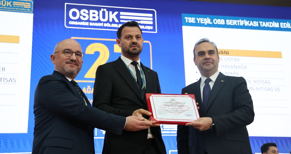 OSBÜK’te düzenlenen törende Sanayi ve Teknoloji Bakanı Mehmet Fatih Kacır tarafından, Diyarbakır Tekstil İhtisas OSB Başkanı Sezai Ayas’a Yeşil OSB sertifikası takdim edildi.